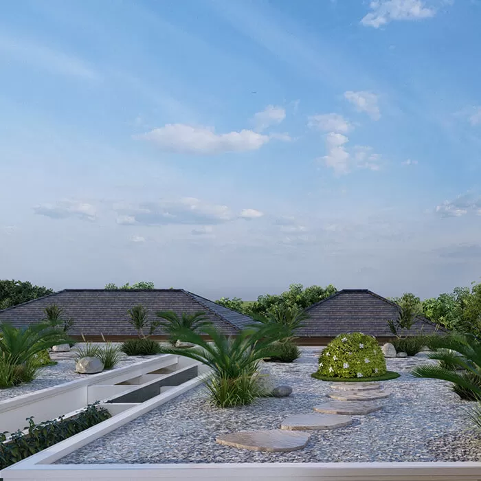 These luxury villas in Bali have luxuriously appointed bedrooms, each with terraces and ensuite bathrooms. From the upstairs balconies, guests see Japanese-zen-inspired rooftop gardens, with the pool, lawns, and surrounding fauna below.